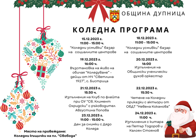На местни таланти залага в Коледната си програма Община Дупница. “Искаме да дадем възможност за изява на местни творци, които да заредят съгражданите ни с коледно настроение и да популяризират творческите си постижения”, коментира зам.-кметът по култура, образование и социални дейности Валентина Караганова. Част от събитията ще се проведат в периода от 15 до 24 декември в трите коледни къщички на площад “Свобода”. На 15 и 18 декември там екипите на социалните центрове организират благотворителен базар “Коледни усмивки”, а на 20-ти декември за дупничани ще свири Общинският ученически духов оркестър. Един от акцентите в празничния афиш на Общината за Коледа е изявата на двамата китаристи от “Sunblinds” Петър Тодоров и Калоян Стоянов.