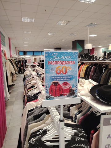 На половин цена можете да изберете стилни и елегантни модели от целия асортимент аутлет, а отново 60% отстъпка изкушават да си изберете зимни дрехи, боти и ботуши. Изобилието от официални рокли, сака, ризи, връхни дрехи за дамите, панталони, сака, якета, блузи и ризи за господата привлича, както и богатият избор на спортни облекла и битов текстил привличат все повече любители на истинското и доказано качество.