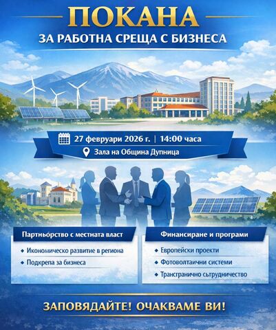 Община Дупница, съвместно с Кюстендилска търговско-промишлена палата – областна структура на БТПП, организира работна среща с местния бизнес. Тя ще се проведе на 27 февруари от 14ч. в партерната зала на кметството. Срещата има за цел да бъдат обсъдени възможностите за по-активно сътрудничество между местната власт и бизнеса, както и актуалните възможности за финансиране, развитие и устойчив растеж на предприятията в региона.