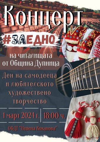 Традиционния си празничен концерт, под надслов "ЗаЕдно", организират читалищата от община Дупница. Той се провежда на 1 март по повод Деня на самодееца и любителското художествено творчество. Началният час е 18ч., а мястото – Общинският драматичен театър “Невена Коканова”. Входът е свободен.