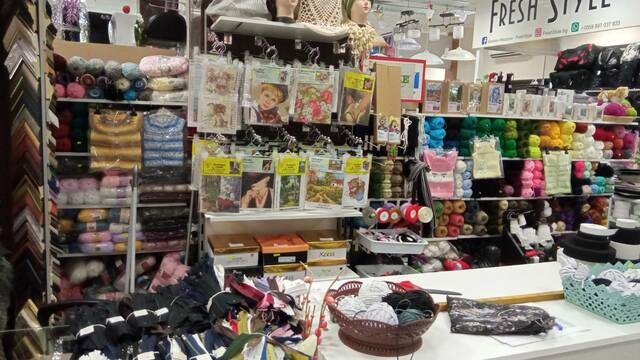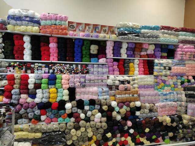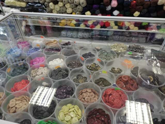 Щандът предлага и изобилие от конци - за шиене и за бродерии, игли, обръчи и куки за плетене, шевни игли – домашни и професионални, ципове и копчета, гергефи, комплекти за шиене на гоблени, за бродерии, декоративни ластици, ресни, панделки и ленти за украса на дрехи, мебели или завеси, подлепващи материали, ширити, аксесоари за пердета и много други. Търговците помагат в избора на най-добрите стоки с индивидуална консултация и ще ви зарадват с малки ремонти, като поправка на цип.