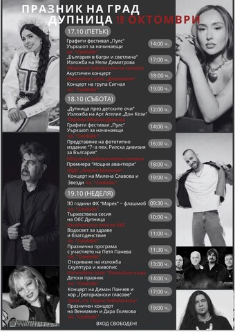 Община Дупница ще отбележи празника на града 19 октомври с тридневна програма. За 17 октомври (петък) са предвидени графити фестивал, изложба на Нели Димитрова, акустичен концерт в Джамията и концерт на група “Сигнал” вечерта на площада.