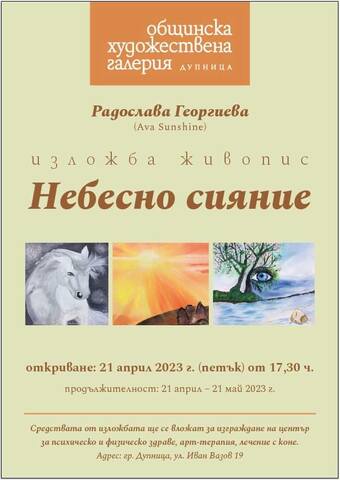 Изложбата “Небесно сияние” ще бъде открита на 21 април, петък, от 17,30ч. в новата Общинска художествена галерия в Дупница. В нея са представени живописни творби, предимно природни пейзажи, с автор Радослава Георгиева. Тя е дупничанка, но след 9-годишно пребиваване в Лондон, се установява в село Горна Козница.