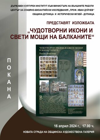 В навечерието на Великденските празници в Дупница ще гостува изложбата „Чудотворни икони и свети мощи на Балканите“. Откриването е на 16 април от 17ч. в новата художествена галерия. Изложбата представлява мобилна фототипна експозиция и е част от програмата на Държавния културен институт към Министъра на външните работи, реализирана съвместно с Центъра за славяно-византийски изследвания „Проф. Иван Дуйчев“ към СУ „Св. Климент Охридски“.