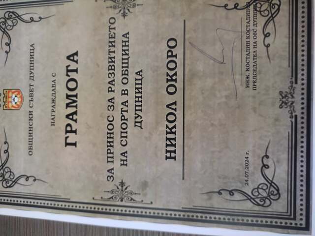 Дупничанката Никол Окоро, която е част от националния отбор по волейбол - девойки, получи почетна грамота от Общински съвет – Дупница за принос за развитието на спорта в общината. Връчи й я лично председателят на Общинския съвет Костадин Костадинов, като я поздрави за европейската шампионска титла на отбора и за отличното й представяне. 16-годишното момиче прие с благодарност и вълнение отличието и красивия букет.