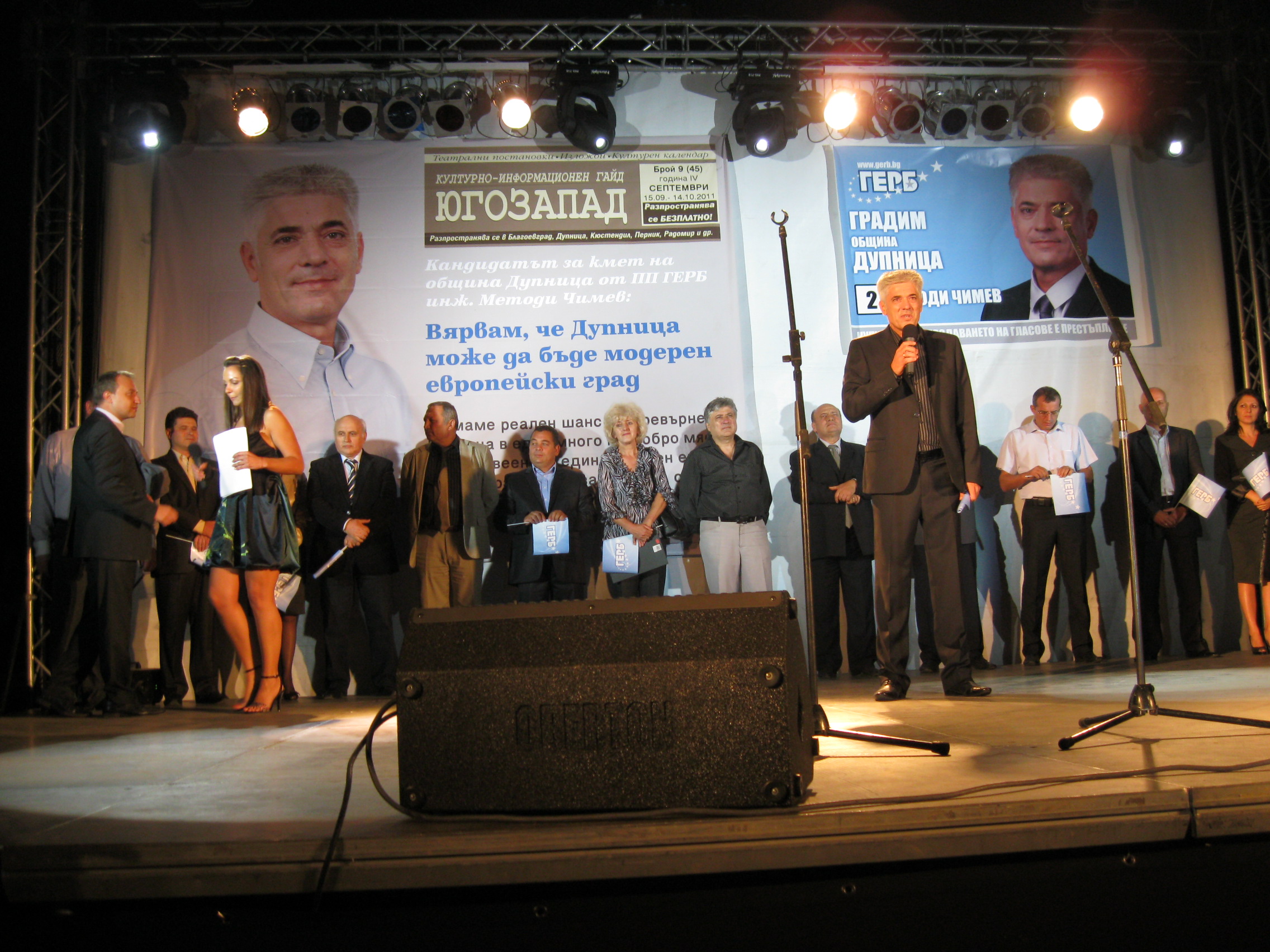 Повече от три часа над 2 000 дупничани се забавляваха на площад “Свобода”, където местната партийна структура представи официално кандидата си за кмет на Дупница инж. Методи Чимев, листата с 33-ма кандидати за общински съветници и претендентите за кметове на населени места. “Аз вярвам, че всички ще успеем заедно”, заяви инж. Чимев, който има дългогодишен опит като ръководител в частния бизнес, като собственик на шивашко предприятие с над 100 служители. Юристи, лекари, икономисти, архитекти, педагози и предприемачи са включени в листата с кандидати за общински съветници на ГЕРБ. Водач е бизнесменът и президент на волейболния отбор “Марек Юнион-Ивкони” Ивайло Константинов, който беше категоричен, че намерението на ГЕРБ е да превърне Дупница в център на икономически и инвестиционен интерес и така да бъдат създадени нови работни места. Според Константинов, за да задържи младите си хора, градът трябва да предложи елитно образование и да възвърне спортната си слава. Трети в листата е настоящият общински съветник от ГЕРБ Крум Милев, който в управленската програма на партията отговаря за сектор “земеделие”. Той е следван от експертът “връзки с обществеността” във водеща българска компания Красимир Георгиев, педиатърката д-р Дияна Кьосева, екскметът на Дупница арх. Асен Пилев и инж. Йордан Йорданов от дупнишкия клон на “Автомагистрали-Хемус”. Осмото място в листата е за пастора от Българска Божия църква Атанас Василев, а след него се нареждат педагожката Илиянка Пилева, специалист “Човешки ресурси” в Национална компания “Железопътна инфраструктура” и съветник през последните две години Емил Панчев и бившият директор на ПГ “Акад. Сергей П. Корольов” Иван Фулев. На дванайсто място е експертът по реклама Иво Янков, а след него в листата кандидат за съветник от ГЕРБ е директорът на РЗОК д-р Матей Попниколов. Следващите две позиции са за Пламен Стойнев – главен данъчен инспектор в НАП и Таня Даскалова – служител в Национална компания “Железопътна инфраструктура”. ГЕРБ ще разчита на свои кандидати за кметове във всички населени места от общината. В най-голямото – Яхиново партията залага на Георги Гущеров, в Крайници на 28-годишната Радостина Велинова, а в Червен брег кандидат е бившият кмет Иванка Черешарска. Борислав Йорданов ще се бори за кметския пост в Джерман. В Бистрица пък ГЕРБ издига на кандидат-кмет също бивш местен управник – Богомил Туповичарски. Малин Джермански е кандидатът за село Баланово, а магистърът по право Борислав Костадинов ще представлява партията на изборите в Самораново.