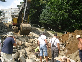Частна фирма, наета да премести канализационен колектор, разруши стълбите към градския пазар в Дупница. Стълбите се премахват от тежка строителна техника, собственост на „Даними“ ЕООД-гр. Кюстендил. Фирмата е наета от кметството чрез пряко договаряне, обясни собственикът Димитър Димитров. Целта на строителните дейности пък била изместване на колектора с няколко метра, след като се оказало, че тръбите пречат на новия собственик на съседния бивш общински имот да строи. Факта бил констатиран, след като дупнишка фирма придоби терена чрез конкурс. Въпреки неприятната „изненада“ местната фирма щяла да плати 8 000 лв. за преместването. Средствата са предоставени на община Дупница под формата на дарение, като по този начин кметството ще се разплати и с кюстендилската фирма, обясни Димитров. Възстановяването на стълбите в предишния им вид трябва да приключи до 10 дни.
