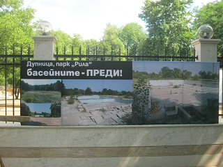 Двата басейна са обградени от зеленина, а на входа на комплекса инвеститорите са онагледили вида, в който бяха преди ремонтните дейности.