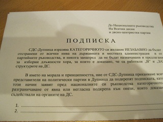 Общинската организация на СДС в Дупница отговори на провалената подписка на “Атака” и ГЕРБ за оставката на председателя на Общинския съвет Явор Тодоров с контрапредложение. Сините удариха неосъщественото предложение за отстраняване на Тодоров със своя подписка. В нея обаче членовете на синята партия в Дупница искат от останалите десни и дясно-центристки партии да дадат съгласието си за незабавно отстраняване от всички нива на държавната и местната администрация и от партийните ръководства и “никога занапред да не бъдат назначавани и предлагани за изборни длъжности хора, за които е доказано, че са работили в и за структурите на Държавна сигурност”. “Нашата подписка е принципна, ние не сочим имена и не се водим от лични мотиви”, коментира лидерът Пламен Данаилов. С подписката си СДС-Дупница приканва всички представители на десни и дясно-центристки парти да заявят пред партийните си ръководства категоричното си разграничаване от явна или негласна подкрепа към онези, които доказано са съдействали на Държавна сигурност, коментира председателят на синята партия Пламен Данаилов. Текста на подписката е одобрен от сините снощи. Пред съпартийците си пък е бил изслушан общинският съветник д-р Васил Бачев, който първо положи, а после оттегли подписа си от предложението на “Атака” за сваляне на Явор Тодоров от председателския пост на местния парламент. Пред сините Бачев обяснил, че се е почувствал подведен и се отказал от подписа си веднага щом разбрал, че в в партийните ръководства, както на “Атака”, така и на ГЕРБ има бивши агенти на Държавна сигурност. Именно подписът на Бачев и този на Пламен Данаилов са първите, фигуриращи в подписката на СДС. От дупнишката партийна организация на синята партия са категорични, че единствено в СДС няма хора, сътрудничили на бившите служби.