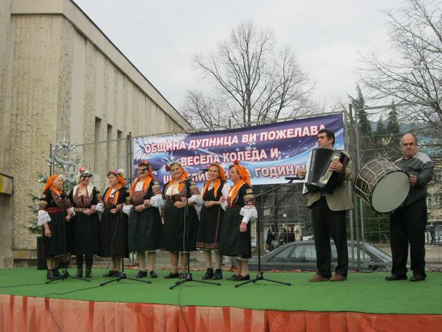 С фолклорен концерт продължи днес коледната програма на община Дупница. Талантливите изпълнителки от фолклорните женски групи в Крайници, Самораново и Бистрица привлякоха вниманието на минувачите на площад “Свобода” днес. От сцената звучаха изпълнения на автентични народни песни от дупнишкия край. Самодейните състави представиха най-добрите си изпълнения и поздравиха дупничани с настъпващите коледни празници. За най-малките жители на града пък в заседателната зала на кметството бяха организирани две представления на Общинския драматичен театър “Боян Дановски” от Перник. Във вълшебния свят на детската пиеса “Пепеляшка” се потопиха възпитаниците на общинските детски градини.