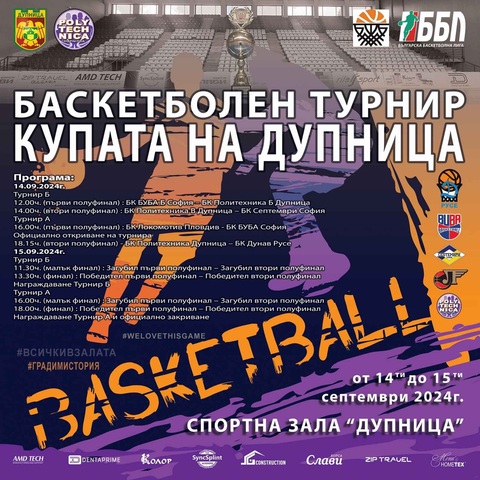 Баскетболният турнир “Купата на Дупница” се провежда на 14 и 15 септември в Спортната зала. Домакините от БК Политехника Дупница са разделили надпреварата в два потока, а новото е, че ще се състои и демонстративен мач между момичетата и момчетата на клуба (12-14 г.). Този двубой ще е в неделния ден от 9.30 ч.